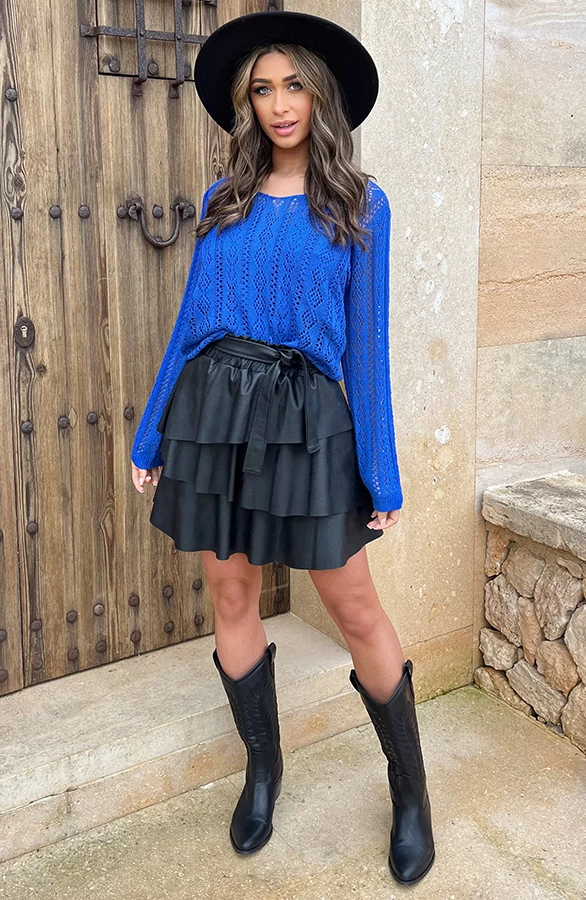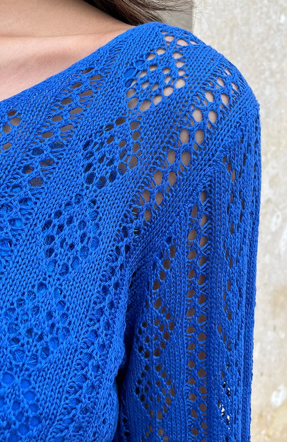 Product: Kobalt is dé trendkleur van dit moment! Deze gehaakte top is voorzien van lange mouwen en een v-hals.