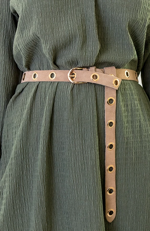 Product: Wauw! Deze riem maakt jouw look helemaal compleet! De beige suedine riem is voorzien van gouden details en een gespsluiting.