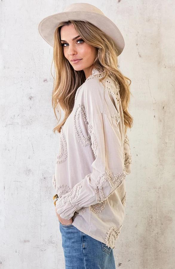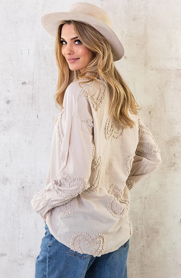 Product: Deze beige blouse is een echte aanwinst voor jouw garderobe! De blouse is voorzien van een v-hals en hartjes patroon.
