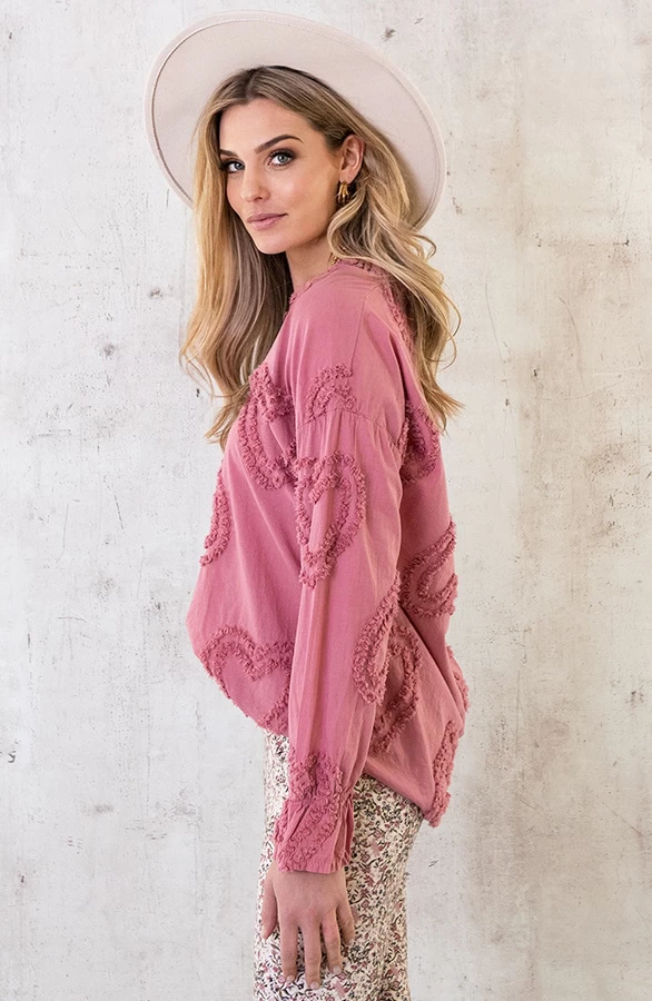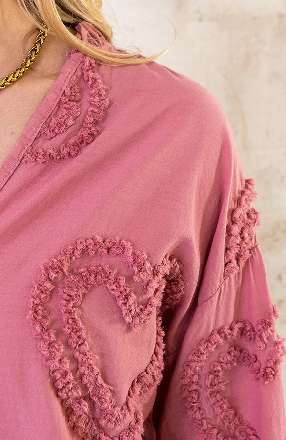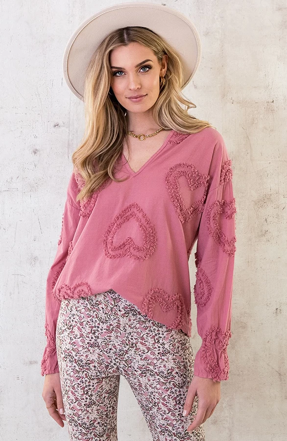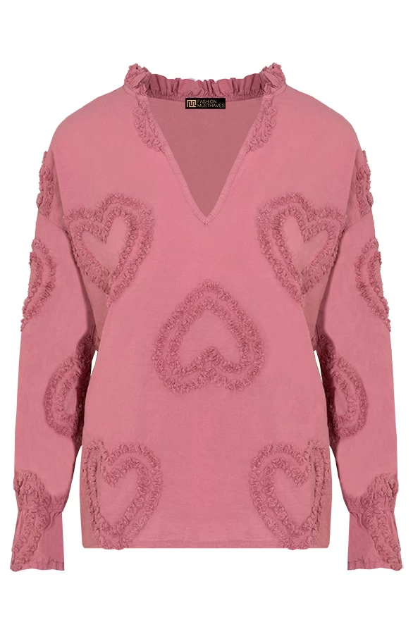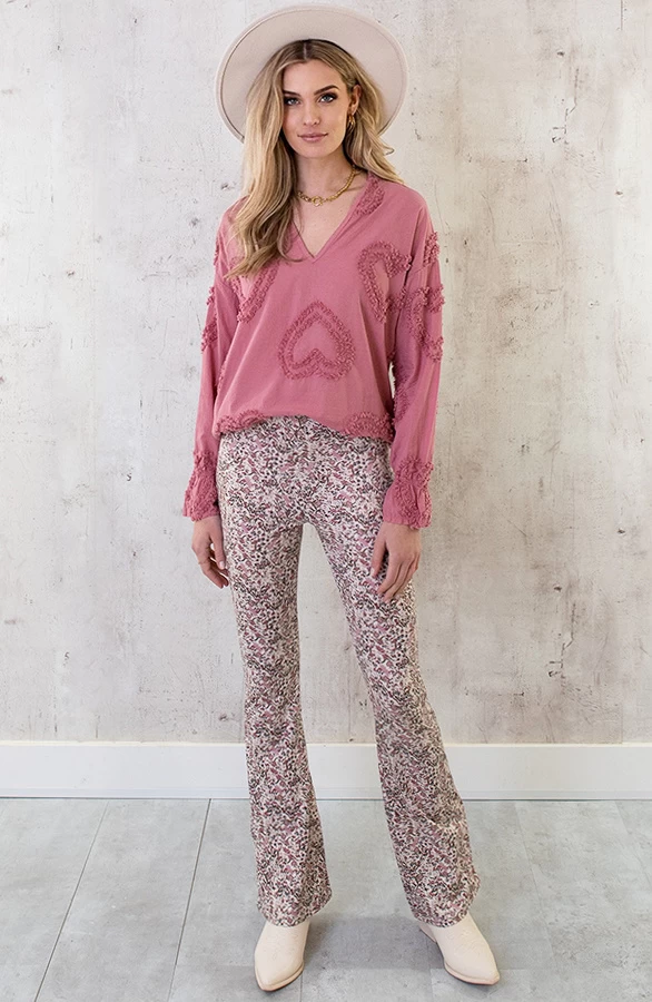 Product: Wauw! Deze blouse met hartjes patroon is té leuk! De blouse is voorzien van elastiek bij de mouwen en een v-hals.