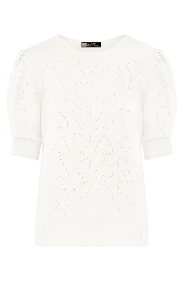 Product: Met deze top zit je altijd goed! De zachte top is voorzien van een hartjesprint en korte pofmouwen.