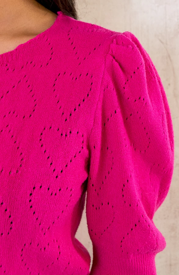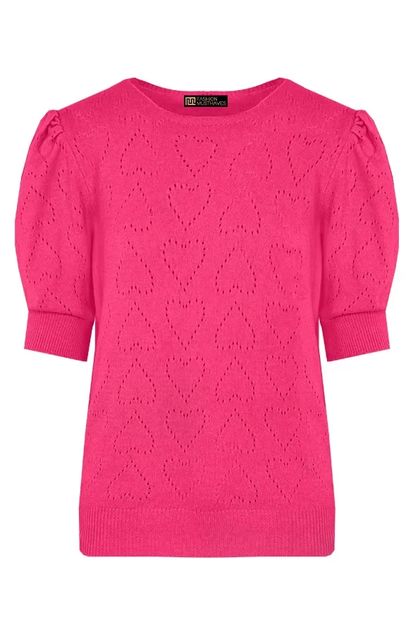 Product: Deze super zachte top is echt een musthave! De top is voorzien van een hartjesprint en pofmouwen.