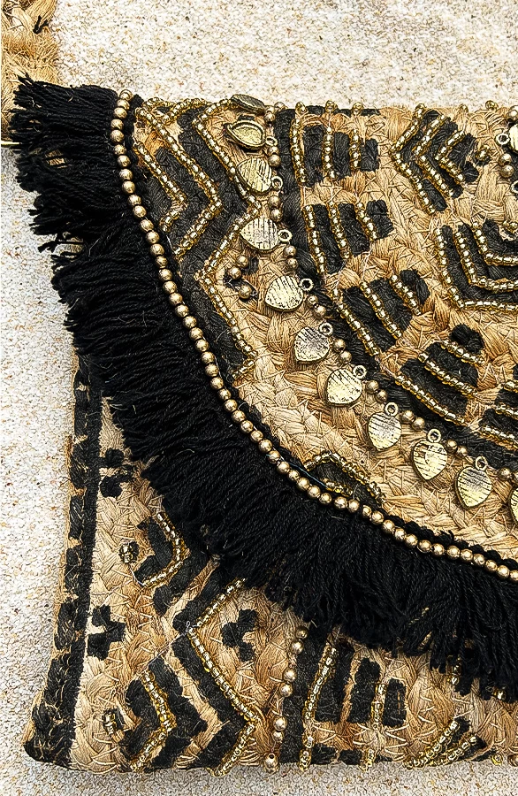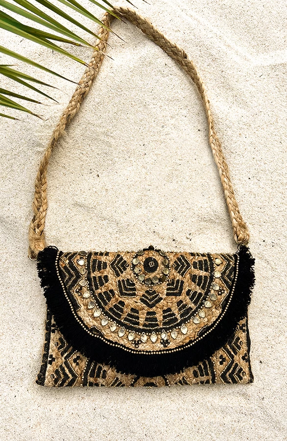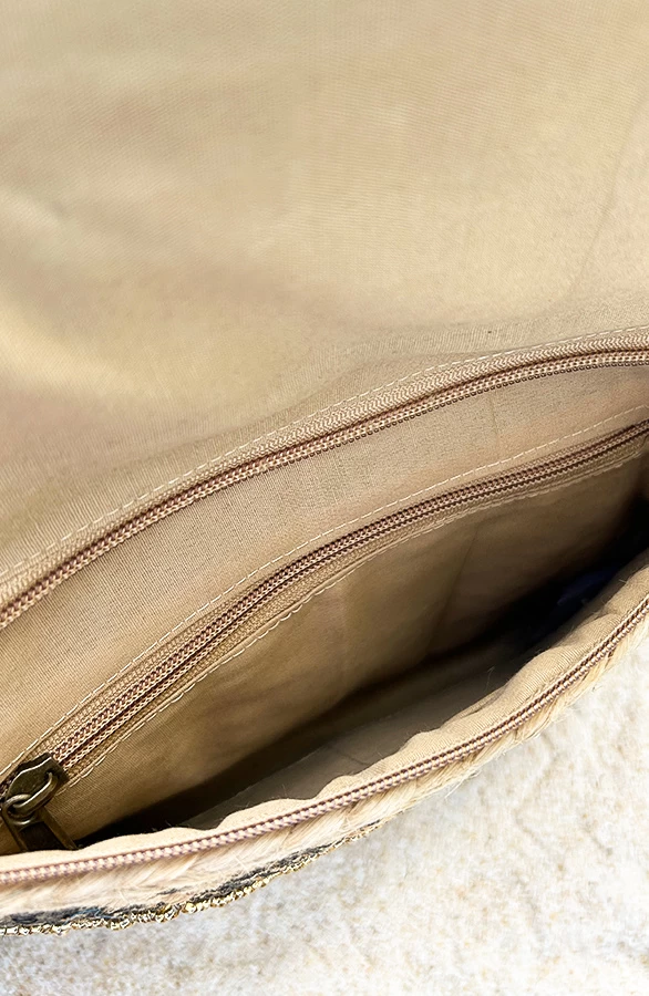 Details: knoop- ritssluiting, lang hengsel en ritsvakje Materiaal: 100% Jute