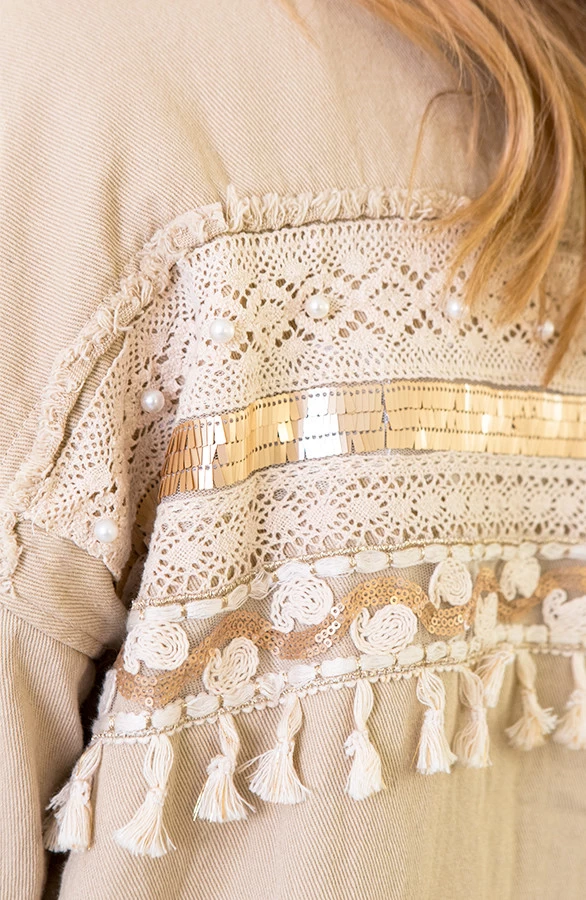 Details: pailletten, tassels, borstzakken, kant, drukknoopjes, parels en gerafeld Materiaal: 100% Katoen