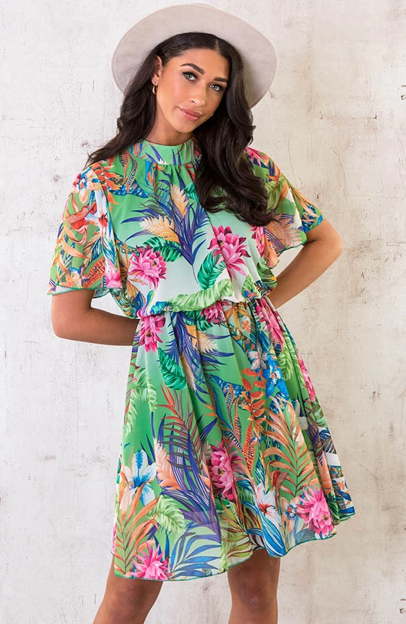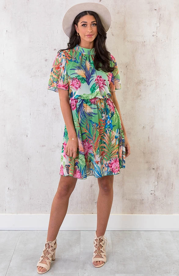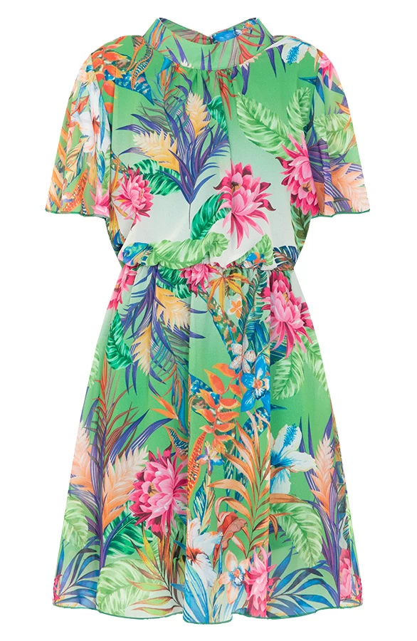 Product: Jungle Vibes! Dit leuke jurkje met print is een echte eyecatcher! De jurk is voorzien van gouden knopen, een onderjurk en heeft elastiek in de taille!