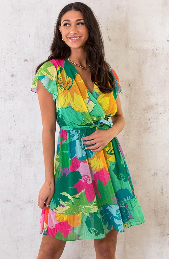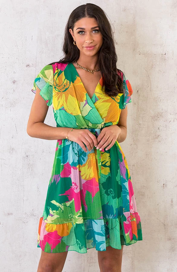 Details: v-hals, korte mouwen, ruches, lint om te strikken, onderjurk, overslag, bloemenprint en elastiek in de taille Materiaal: 100% Polyester