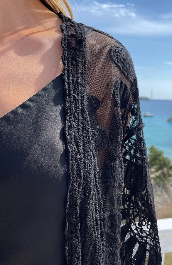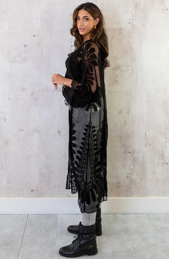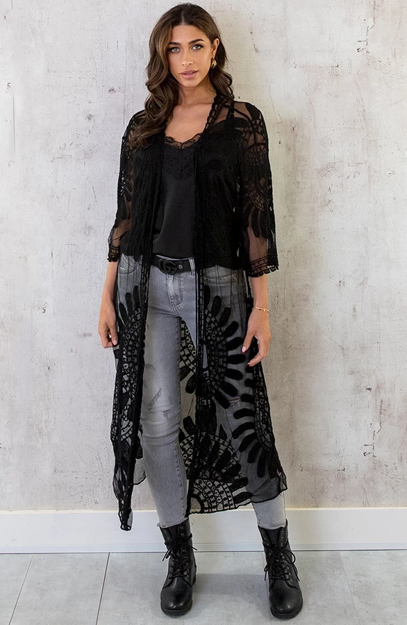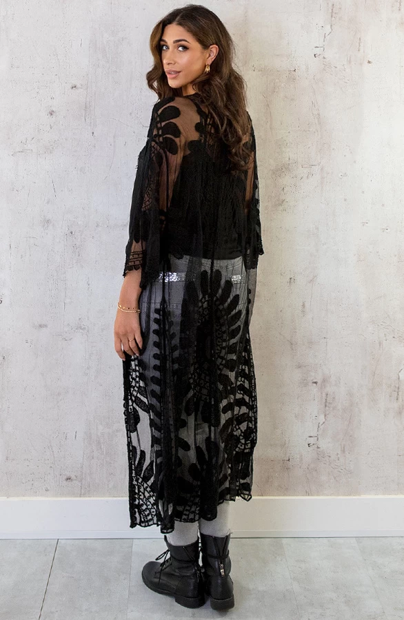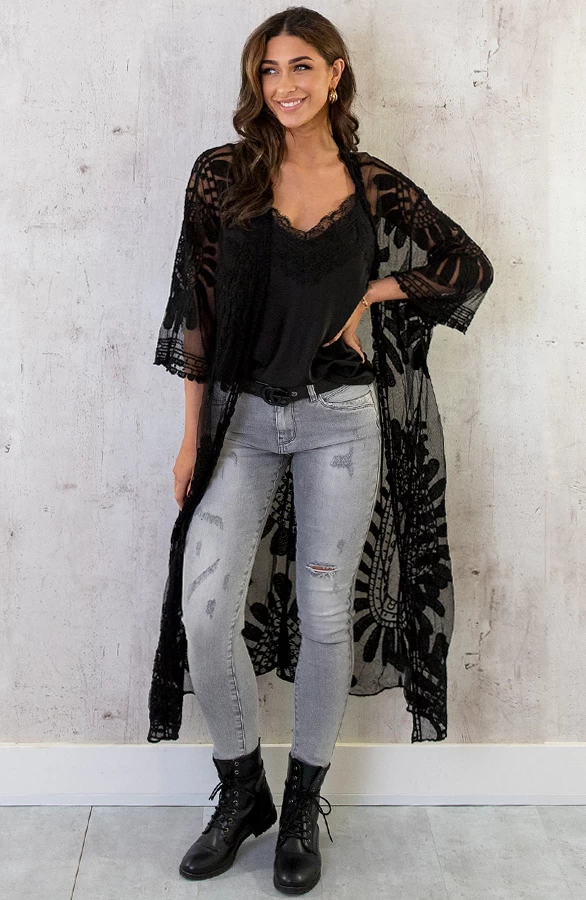Product: Deze te leuke trend ga je weer heel veel zien het komende seizoen! Deze kimono is voorzien van een kanten patroon en een doorschijnende stof.