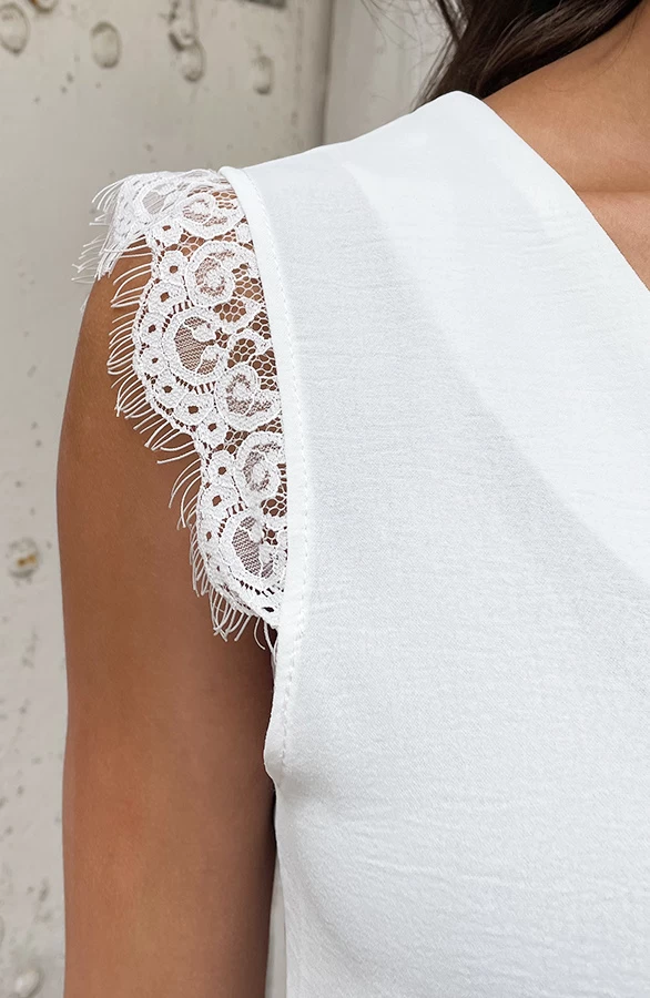 Details: v-hals, ruches en voorzien van kant