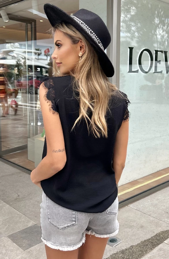 Product: YAY! Deze top is perfect voor iedere outfit! De top is voorzien van een v-hals, ruches en kant. Verkrijgbaar in meerdere kleuren!