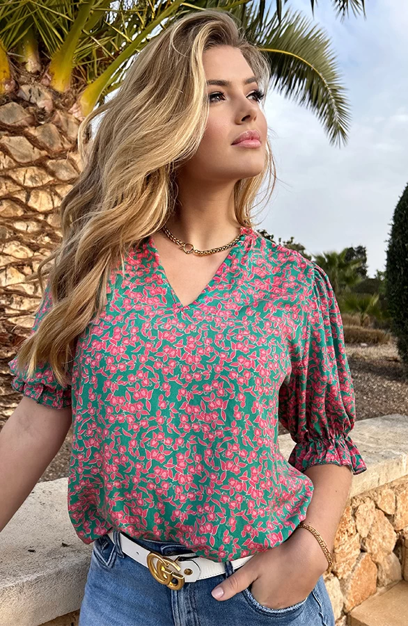 Product: Hoe leuk is deze bloemenprint blouse?! De groene oversized blouse is voorzien van een vrolijke roze print!