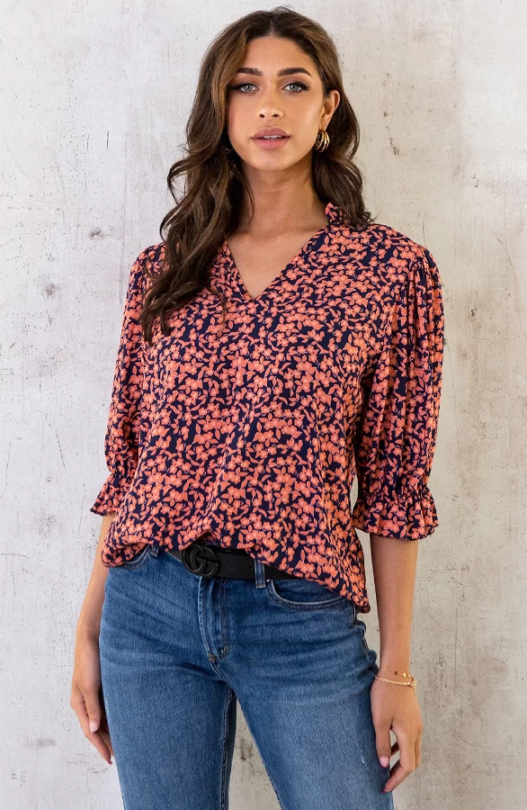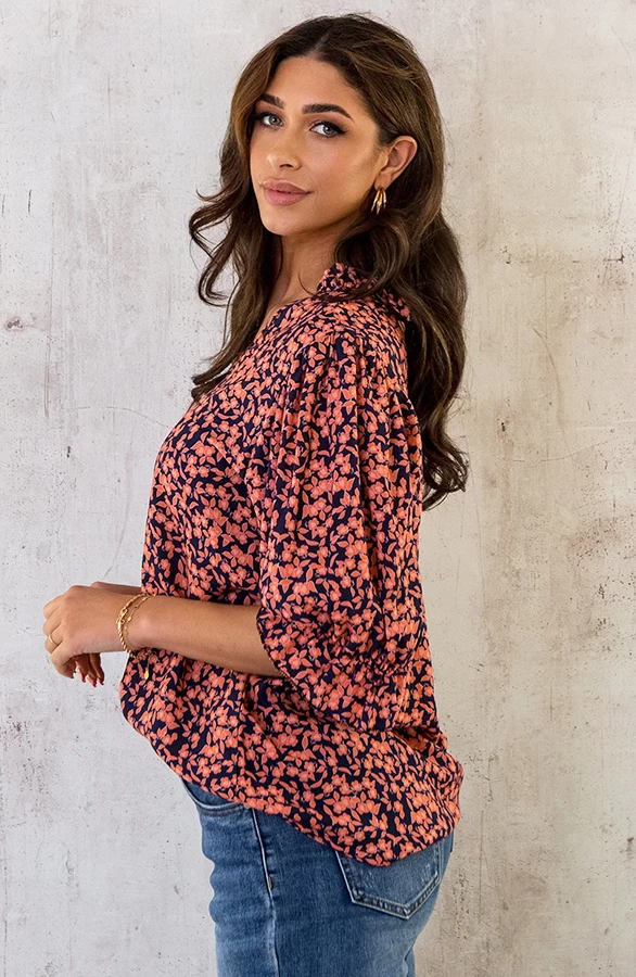 Details: v-hals, oversized, bloemenprint en elastiek bij de mouwen
