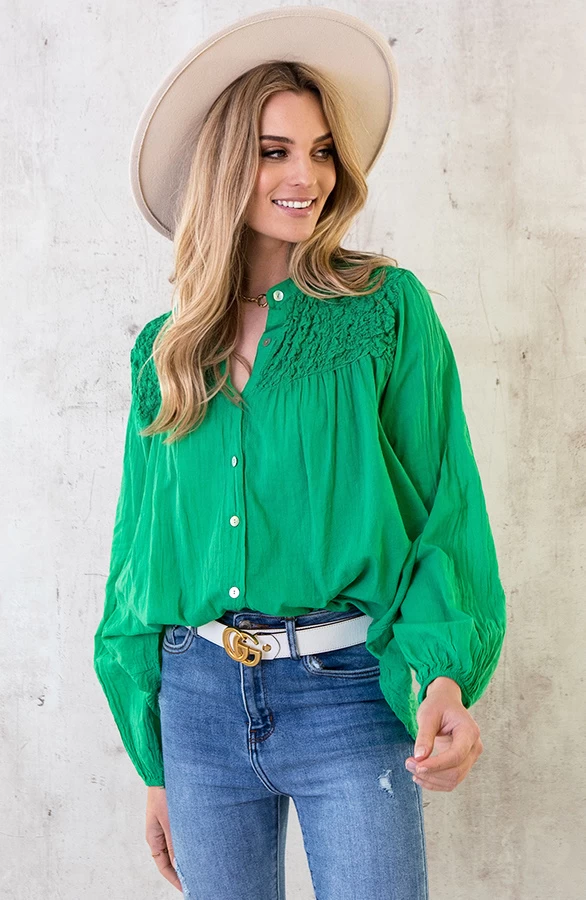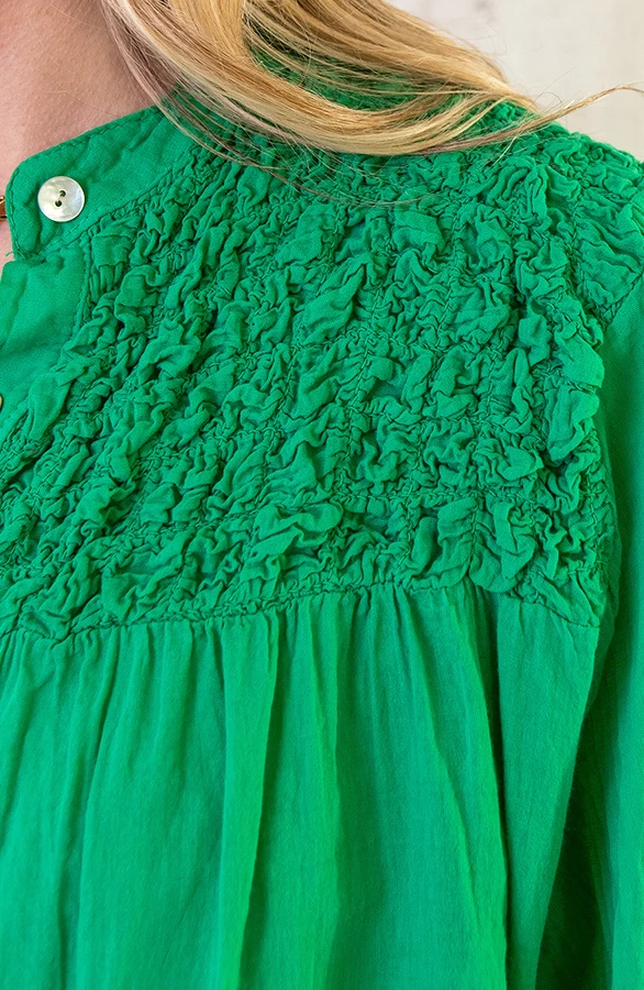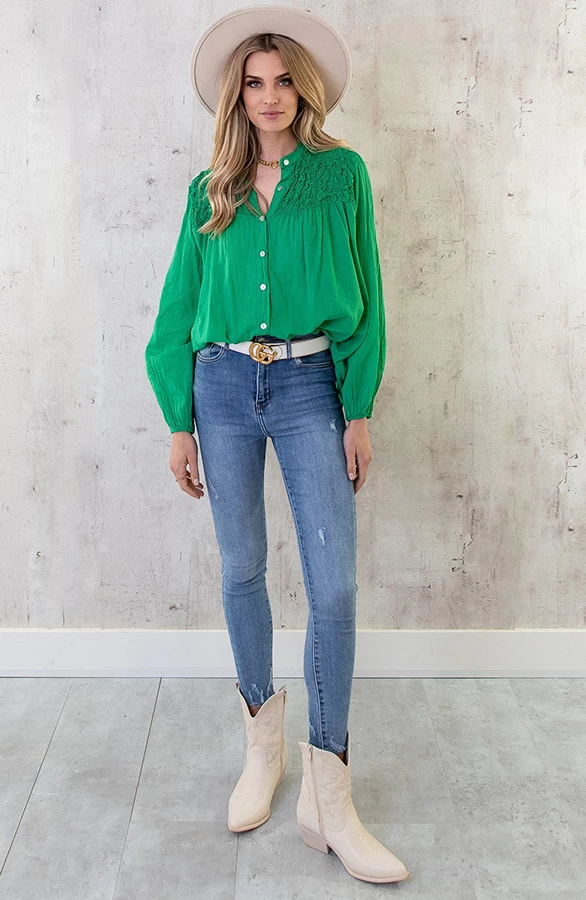 Product: Trend alert! Deze groene blouse met leuke details is een echte eyecatcher! De katoenen blouse is voorzien van een knoopsluiting en van elastiek bij de mouwen.