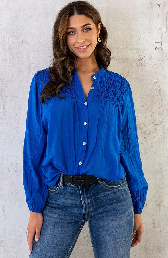 Product: Wij zijn fan van de trendy kleur kobalt! Deze katoenen blouse is dun gewoven en zit daarom heerlijk luchtig!