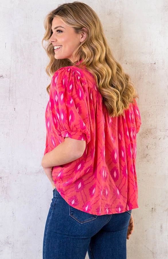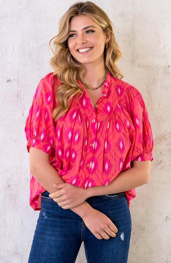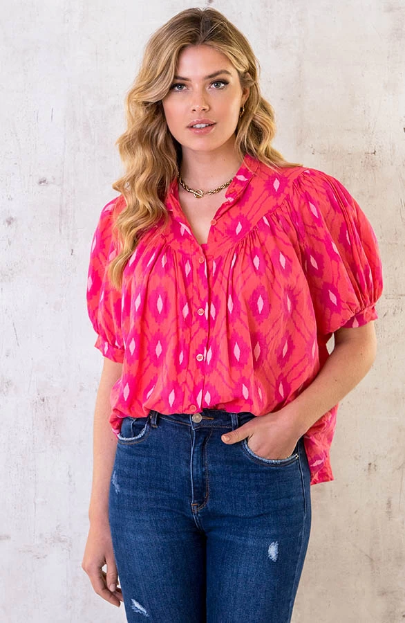 Product: Nergens goedkoper! OH-MY! Deze gave blouse valt erg oversized en is voorzien van grote pofmouwen. De katoenen blouse is heerlijk luchtig en behoort absoluut tot onze favoriete items! Stylingytip: draag de blouse aan de voorkant een stukje in de broek/rok.