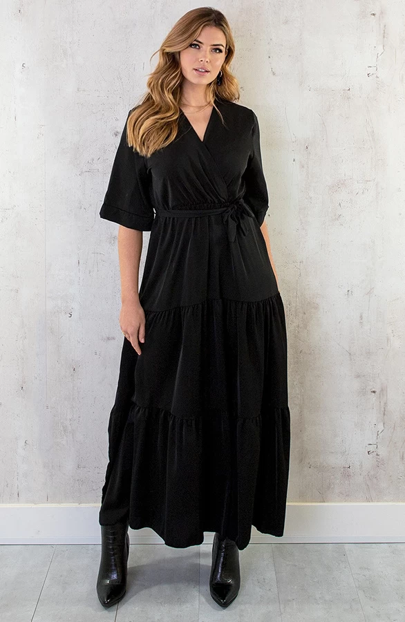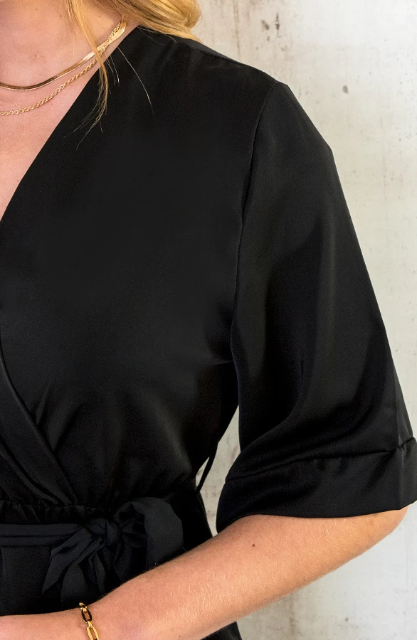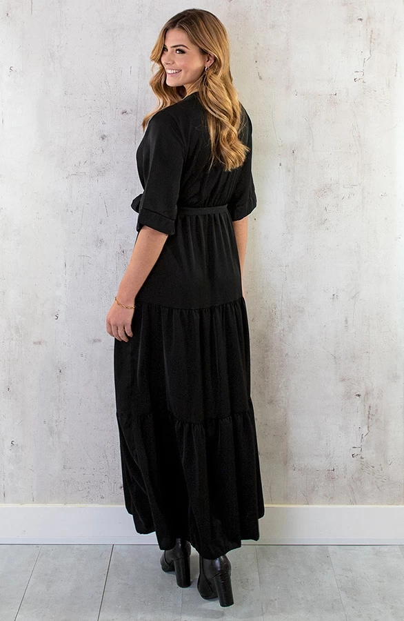 Product: In deze jurk zal jij zeker stralen! De zwarte maxi jurk is voorzien van een glanzende stof en een lint om te strikken in de taille.