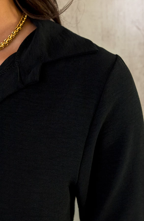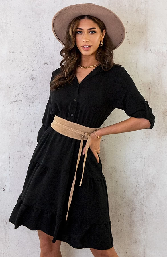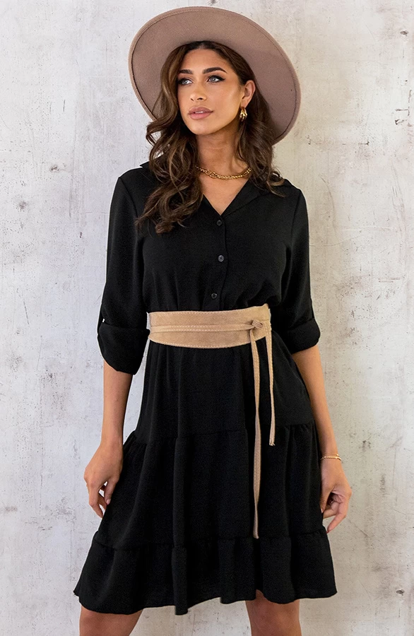 Product: Pretty black dress! Deze laagjes jurk is té leuk! Voorzien van opgerolde mouwen, een lint om te strikken en elastiek in de taille.