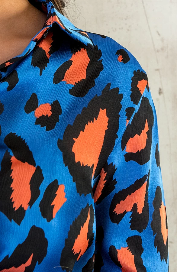 Details: v-hals, knoopsluiting, glanzende stof, panterprint en knoopje bij de mouwen Materiaal: 100% Polyester