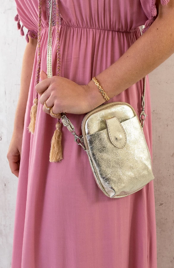 Product: Dit kleine tasje is toch geweldig?! Perfect om je telefoon in te bewaren! Het tasje heeft meerdere vakjes, één in het midden met een ritssluiting en twee aan allebei de buitenkanten met drukknoop. Verder heeft de tas een suedine stof aan de binnenkant.