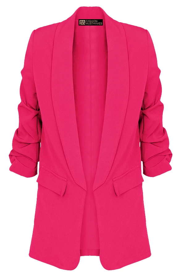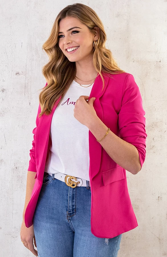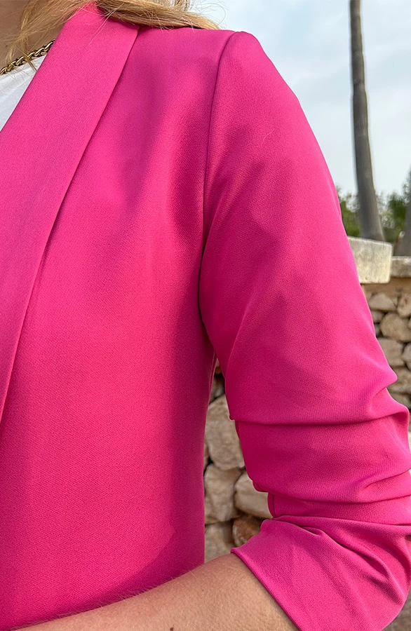 Product: Wauw! Hoe gaaf is deze fuchsia blazer?! Deze kleur mag niet ontbreken in jouw garderobe! De blazer is voorzien van schoudervullingen en driekwart mouwen.