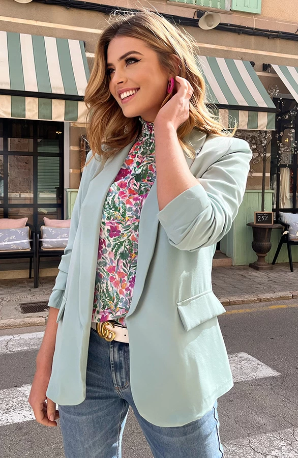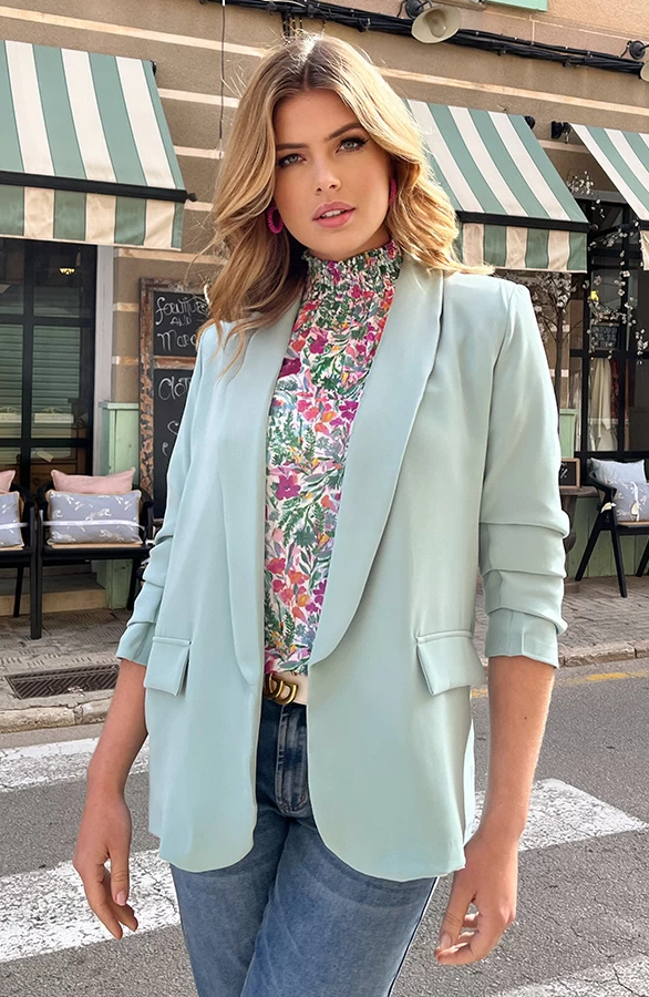 Product: Wauw! Hoe gaaf is deze mintkleurige blazer?! De blazer is voorzien van driekwart mouwen, schoudervullingen en nepzakken. Verkrijgbaar in heel veel trendy kleuren!