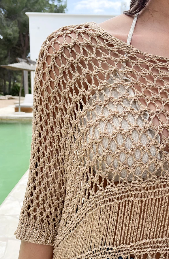 Details: franje, ronde hals, korte mouwen, oversized, gehaakte stof, goud glitterdraad en lurex Materialen: 12% Nylon, 88% Acryl