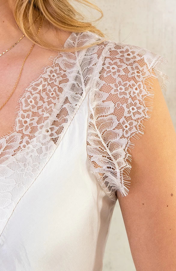 Details: v-hals, voorzien van kant en glanzende stof Materiaal: 100% Viscose