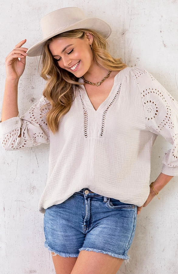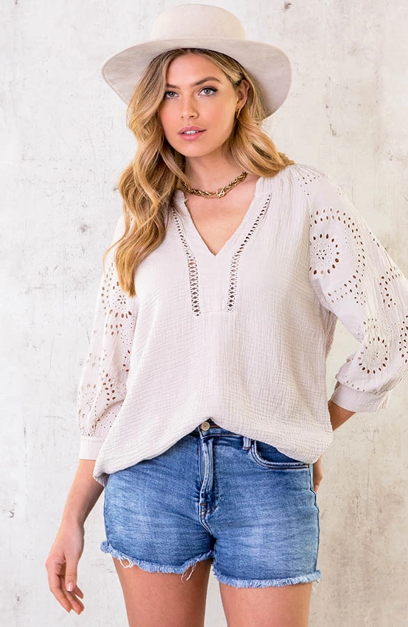 Product: Deze beige blouse mag niet ontbreken in jouw garderobe! De katoenen blouse is voorzien van driekwart mouwen met embroidery en een knoopje bij de mouwen.