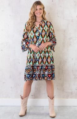 Details: v-hals, lange mouwen, onderjurk, semi-transparant, bijpassend ceintuur in de taille, elastiek in de taille en elastiek bij de mouwen Materialen: 50% Viscose, 50% Polyester