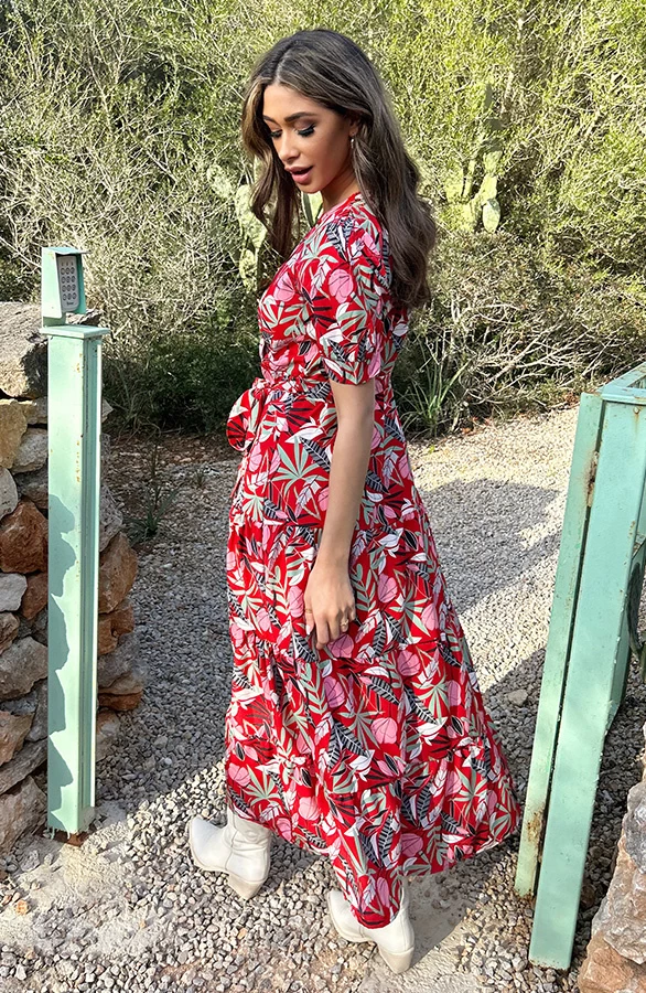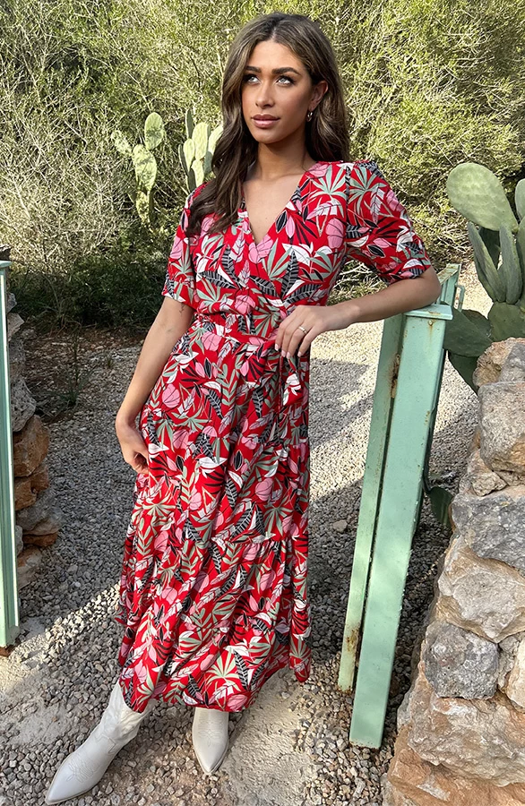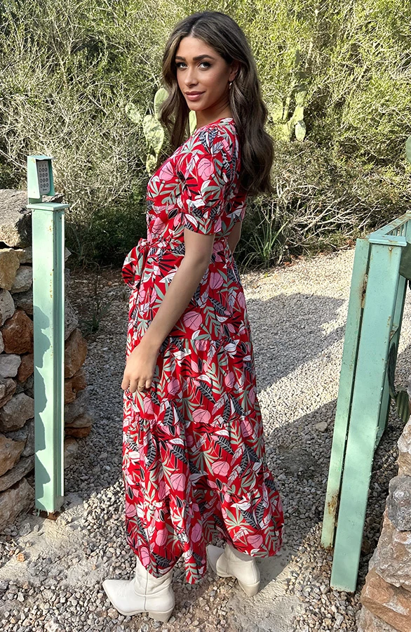 Product: Wauw! Wat een eyecatcher! Deze rode maxi jurk met print is een aanwinst voor jouw garderobe! De jurk is voorzien van een v-hals en een lint om te strikken in de taille.