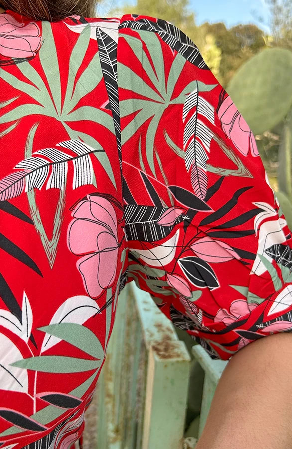 Details: riemlussen, v-hals, korte mouwen en lint om te strikken Materialen: 45% Polyester, 55% Polyamide