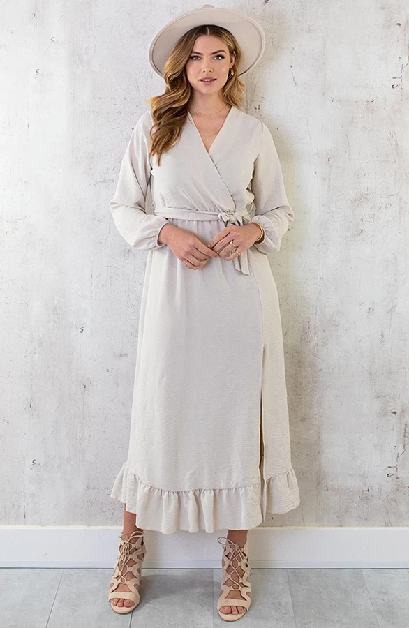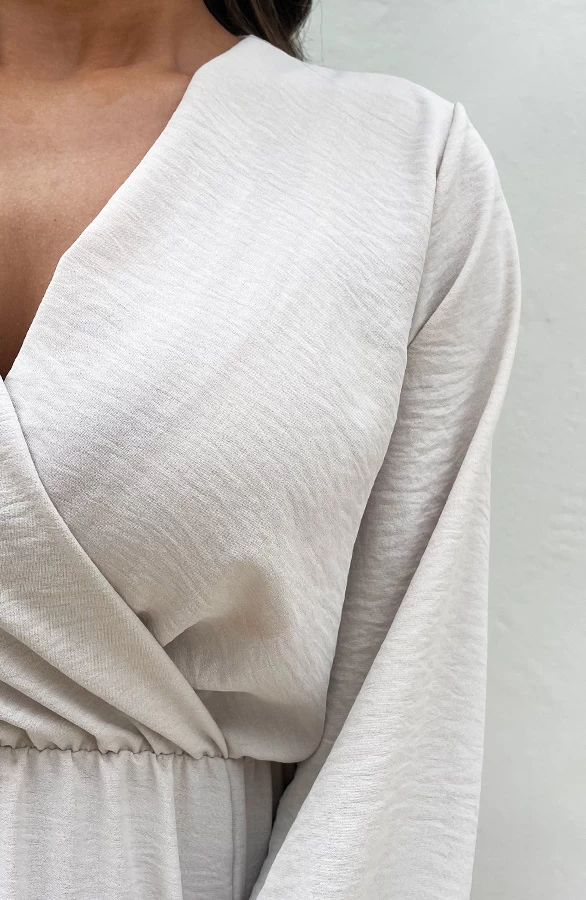 Product: Hoe pretty is deze beige jurk?! De jurk heeft lange mouwen met elastiek, een v-hals en een lint om te strikken.