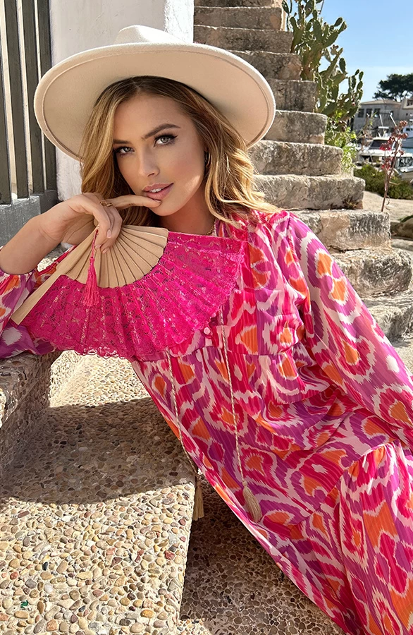 Details: v-hals, lange mouwen, knoopsluiting, verschillende laagjes, onderjurk, semi-transparant, kwastje, elastiek bij de mouwen en touwtjes