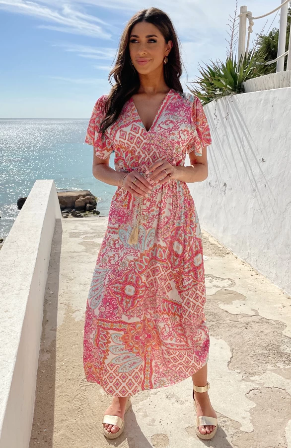 Details: v-hals, korte mouwen, elastiek in de taille en kwastje Materiaal: 100% Viscose