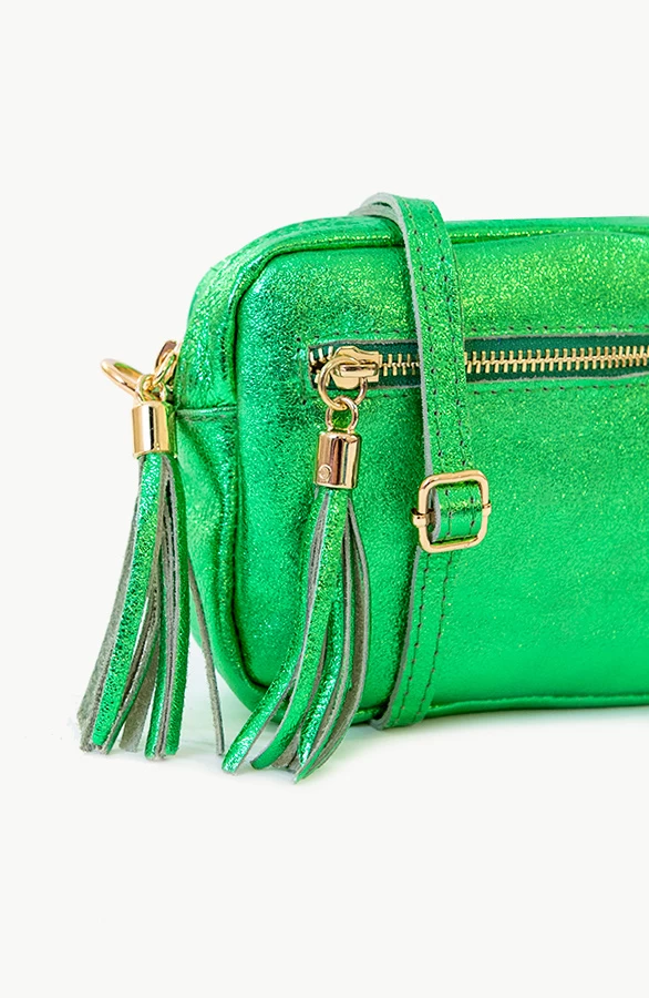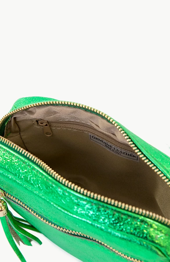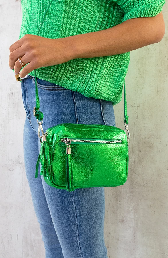Details: ritsssluiting, metallic stof, kwastje, lang hengsel en klein zijvakje Materiaal: 100% Leer