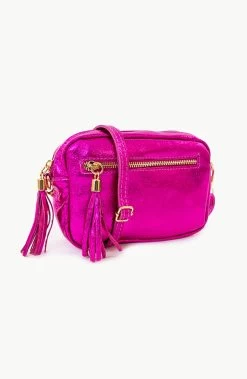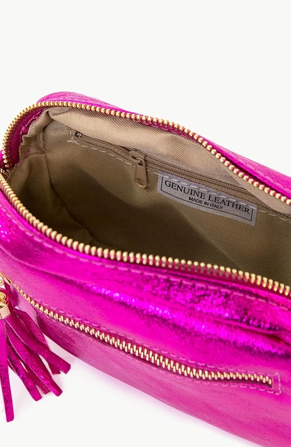 Details: ritsssluiting, metallic stof, kwastje, lang hengsel en klein zijvakje Materiaal: 100% Leer