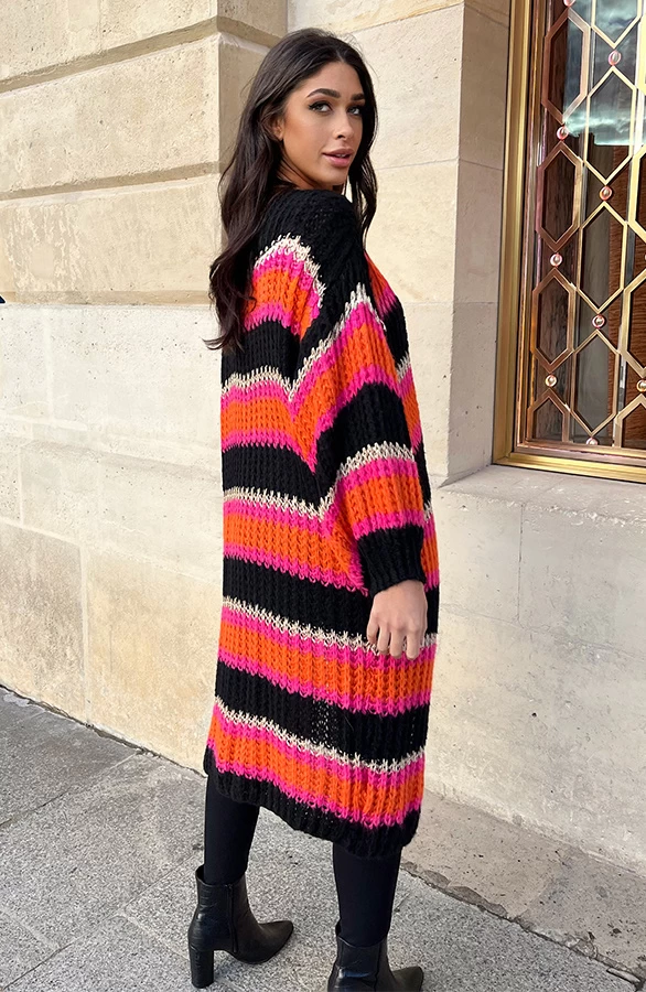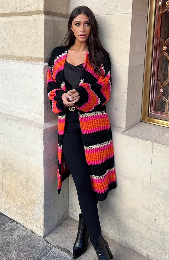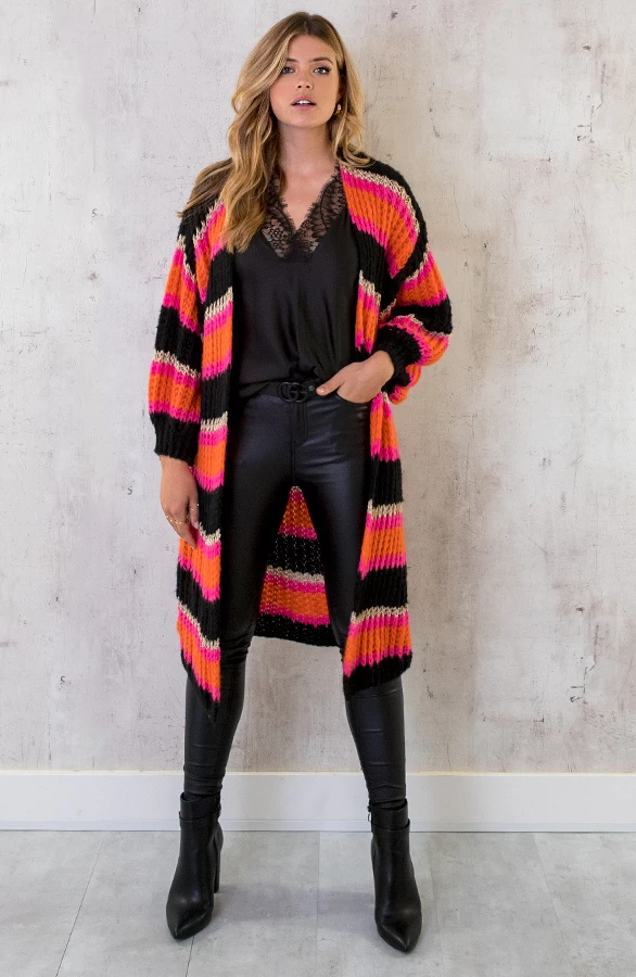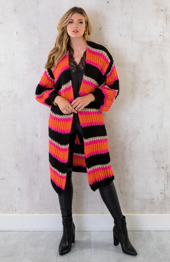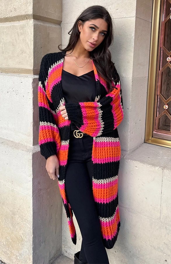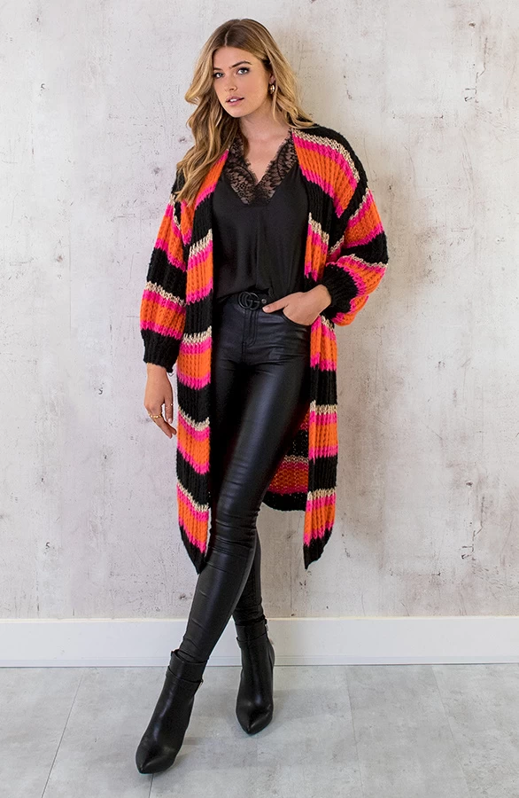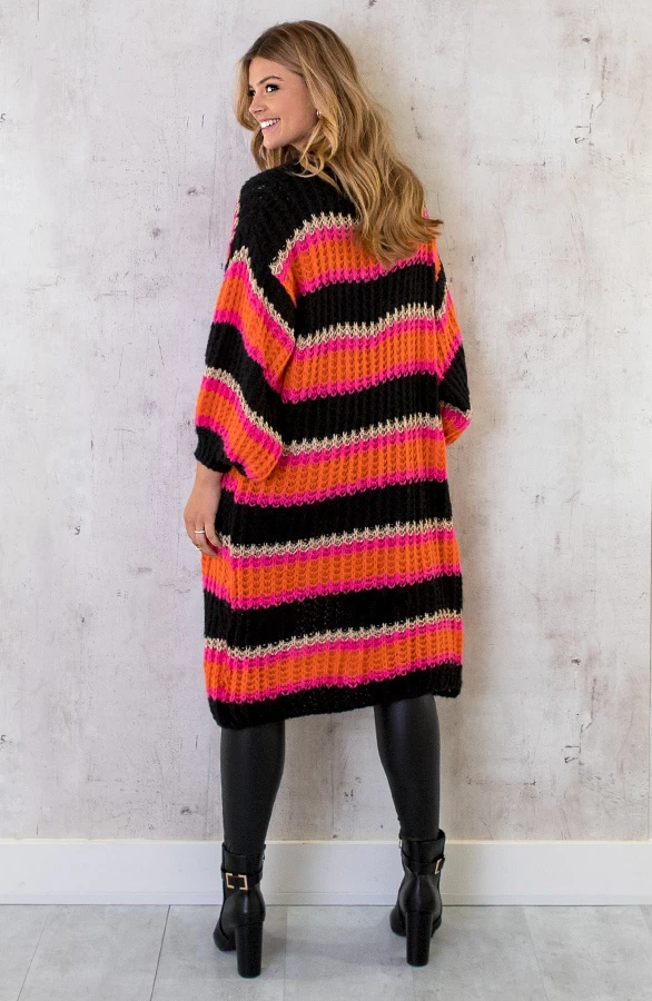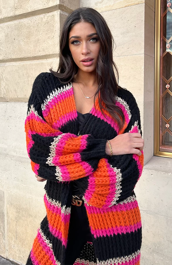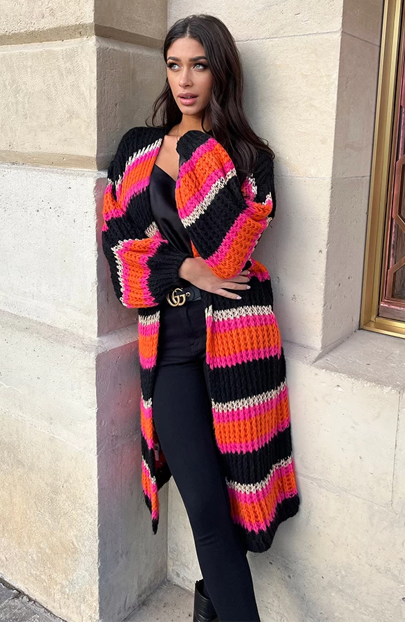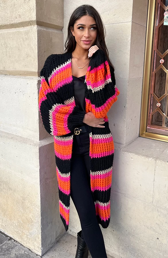 Details: lange mouwen, gebreid, gouden details en enkel open te dragen Materialen: 7% Wol, 7% Viscose, 29% Polyamide, 56% Acryl