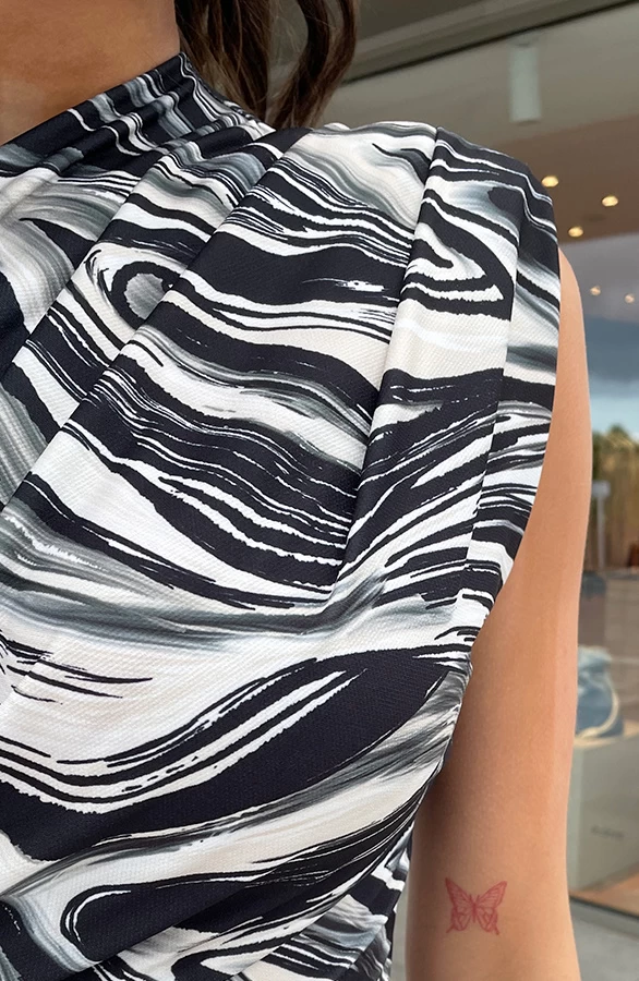 Product: In deze jurk komt jouw figuur perfect naar voren! De gedrapeerde jurk met print is voorzien van schoudervullingen en een split aan de onderkant.