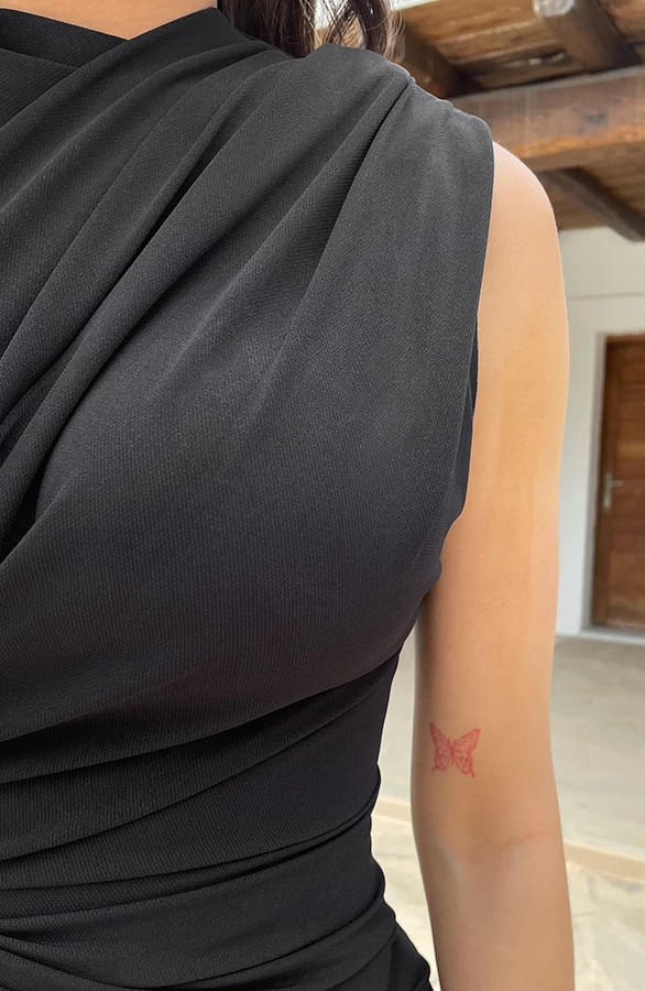 Product: Wauw! Dit prachtige jurkje is perfect voor een speciale gelegenheid! De zwarte gedrapeerde jurk is voorzien van een split aan de onderkant en van schoudervullingen.