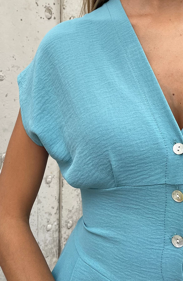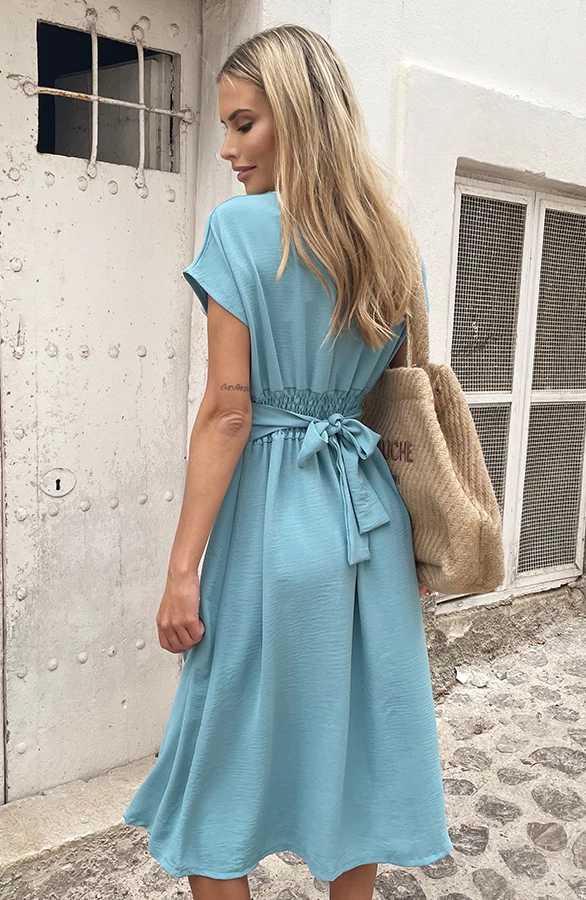 Product: Oohlala! Deze mintkleurige jurk is een echte músthave! De midi jurk is voorzien van een knoopsluiting en een elastiek op de rug.