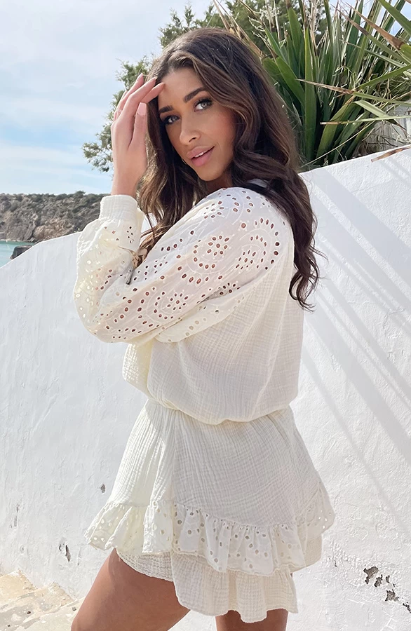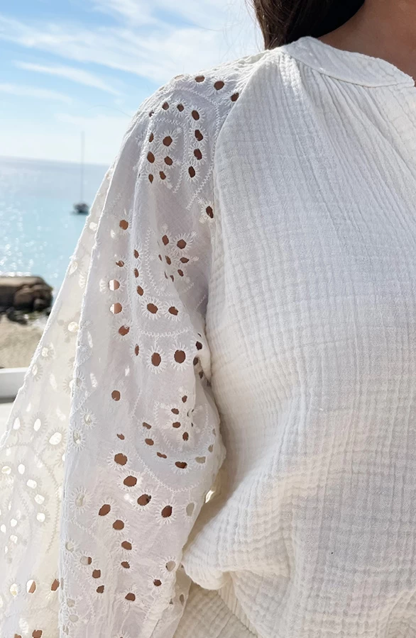 Product: Yay! Wij zijn helemaal in love met deze blouse! De mousseline blouse is voorzien van broderie details. TIP: Combineer deze blouse met de bijpassende skort!