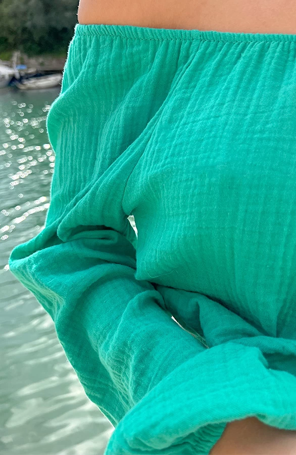 Details: elastieken band, offshoulder en elastiek bij de mouwen Materiaal: 100% Katoen