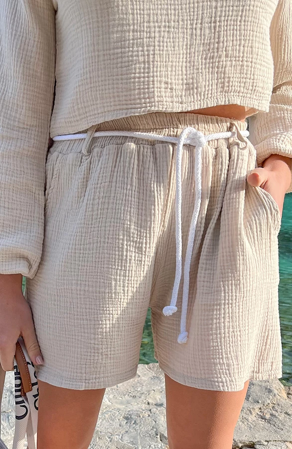 Product: Hoe gaaf is deze beige shorts?! Het comfy broekje is voorzien van een elastieken band en steekzakken.