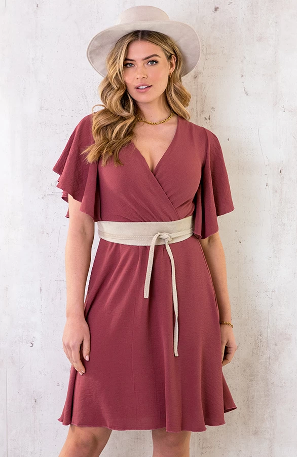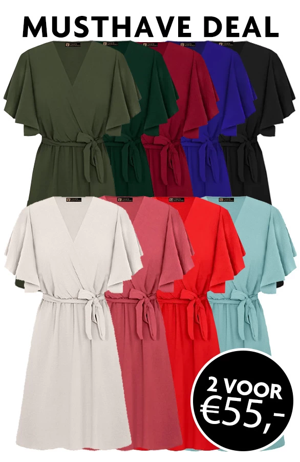 Details: v-hals, vleermuismouwen, bijpassend ceintuur in de taille en elastiek in de taille