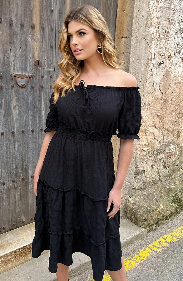 Product: Je kan nooit genoeg zwarte jurken hebben! Deze offshoulder jurk met elastiek in de taille is perfect voor meerdere gelegenheden!