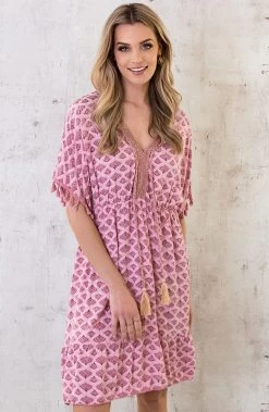 Details: v-hals, korte mouwen, elastiek in de taille, pompons, gevlochten touwtjes en lurex Materiaal: 100% Viscose