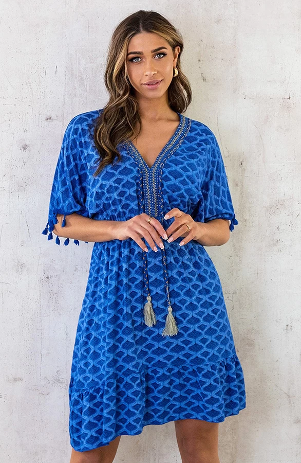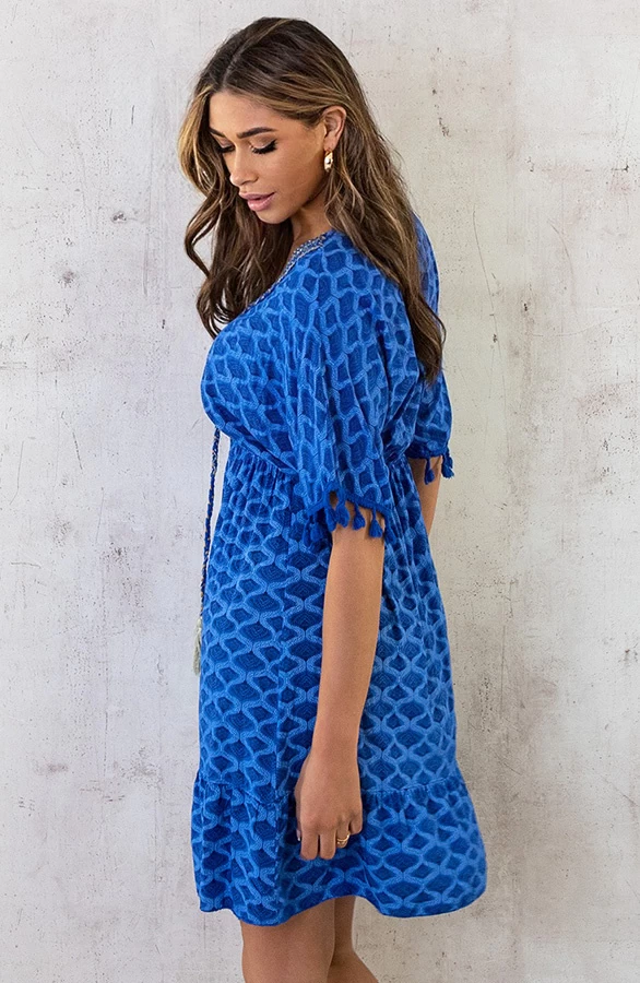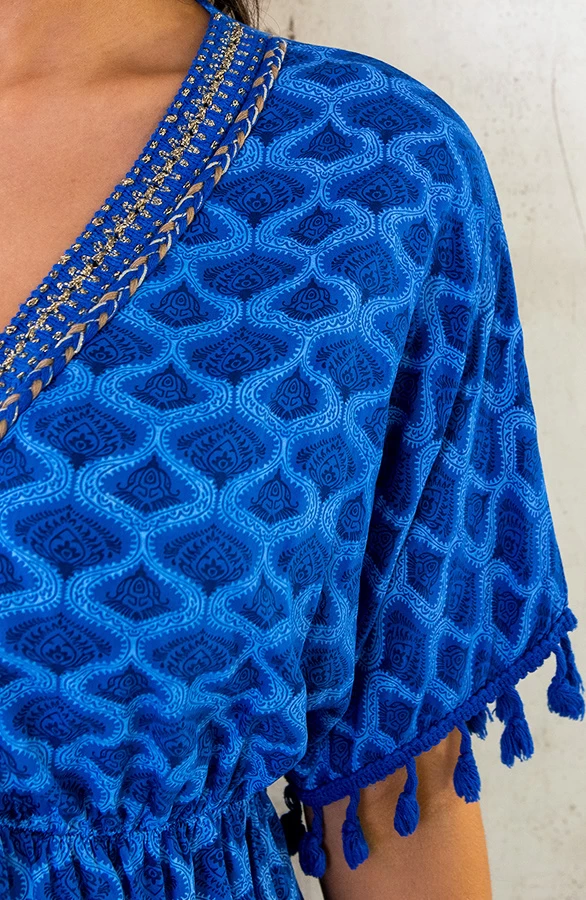 Details: v-hals, korte mouwen, elastiek in de taille, pompons, gevlochten touwtjes en lurex Materiaal: 100% Viscose