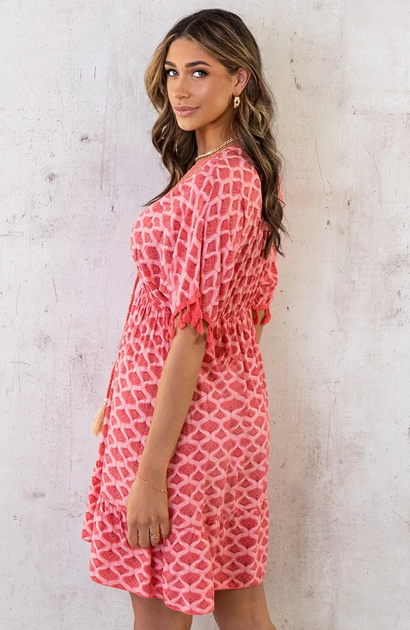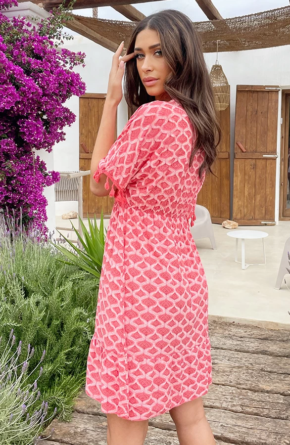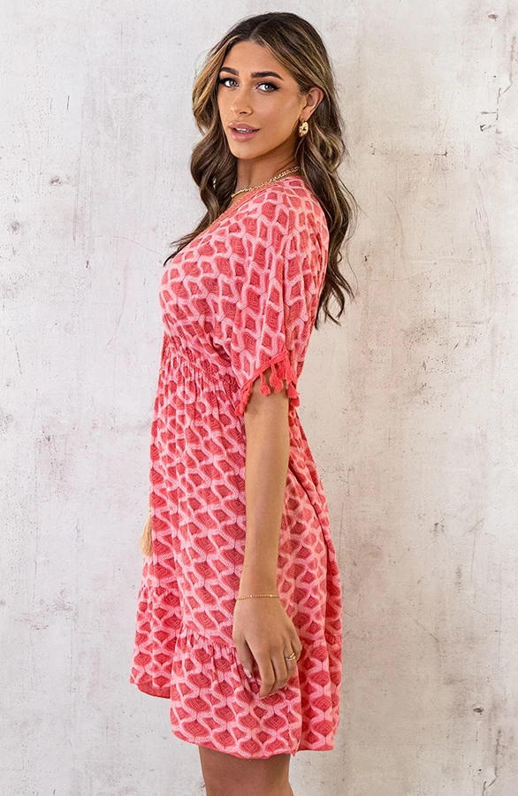 Details: v-hals, korte mouwen, elastiek in de taille, pompons, gevlochten touwtjes en lurex Materiaal: 100% Viscose