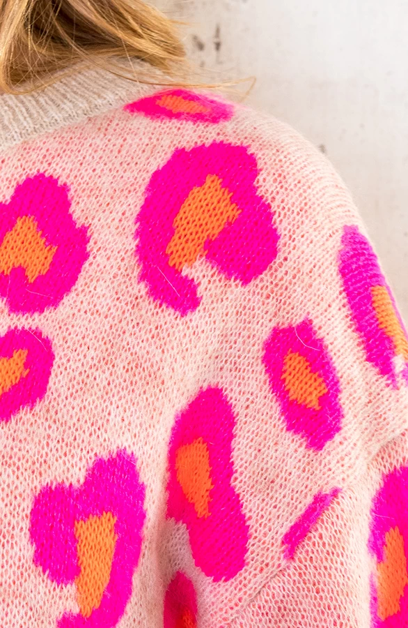 Details: ronde hals, lange mouwen, oversized en panterprint Materialen: 30% Nylon, 40% Acryl, 30% Mohair