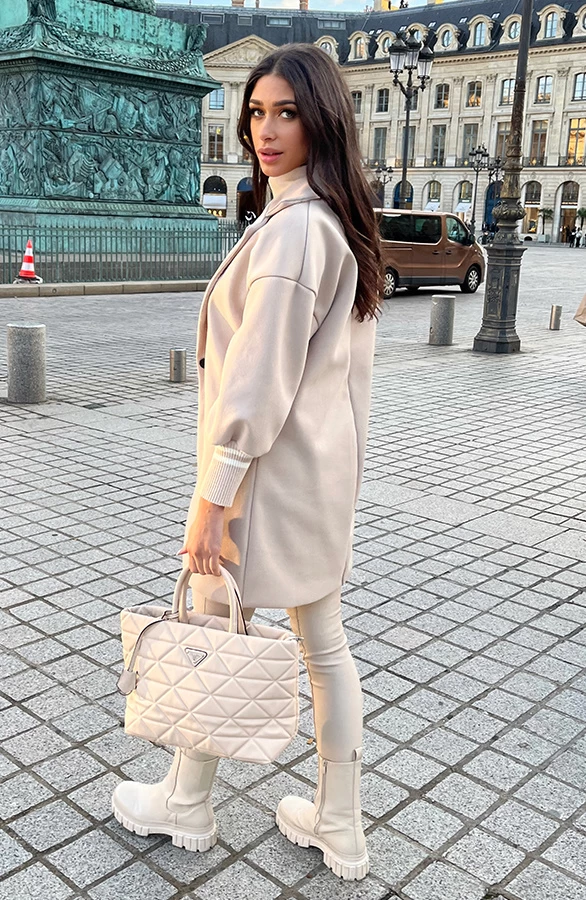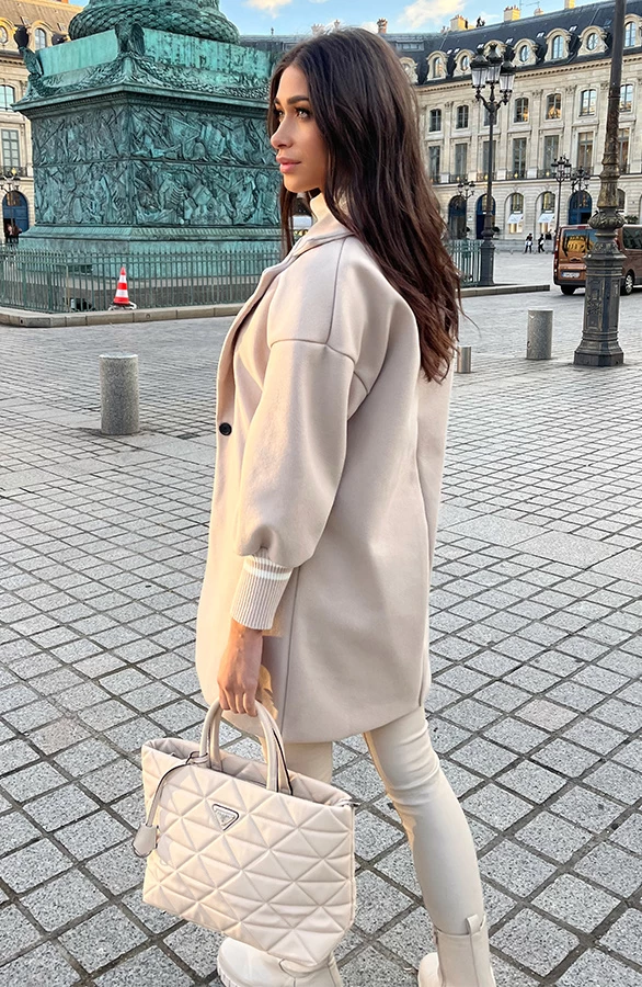 Product: Deze jas met elastiek en strepen bij de mouwen wil je toch hebben?! De beige jas is gemakkelijk te combineren met jouw favo outfits!
