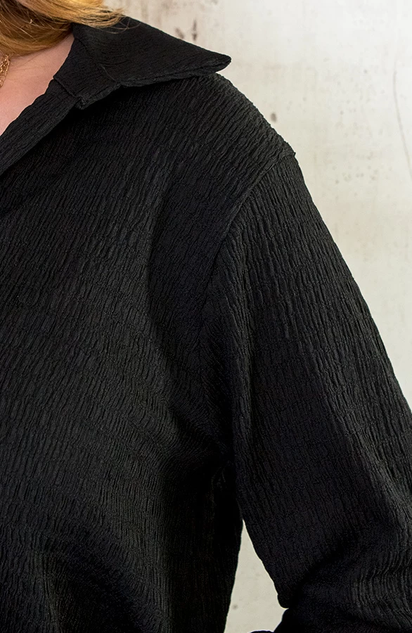 Product: Een zwarte blouse is altijd een goed idee! Deze smocked blouse heeft een oversized pasvorm en is gemakkelijk te combineren!